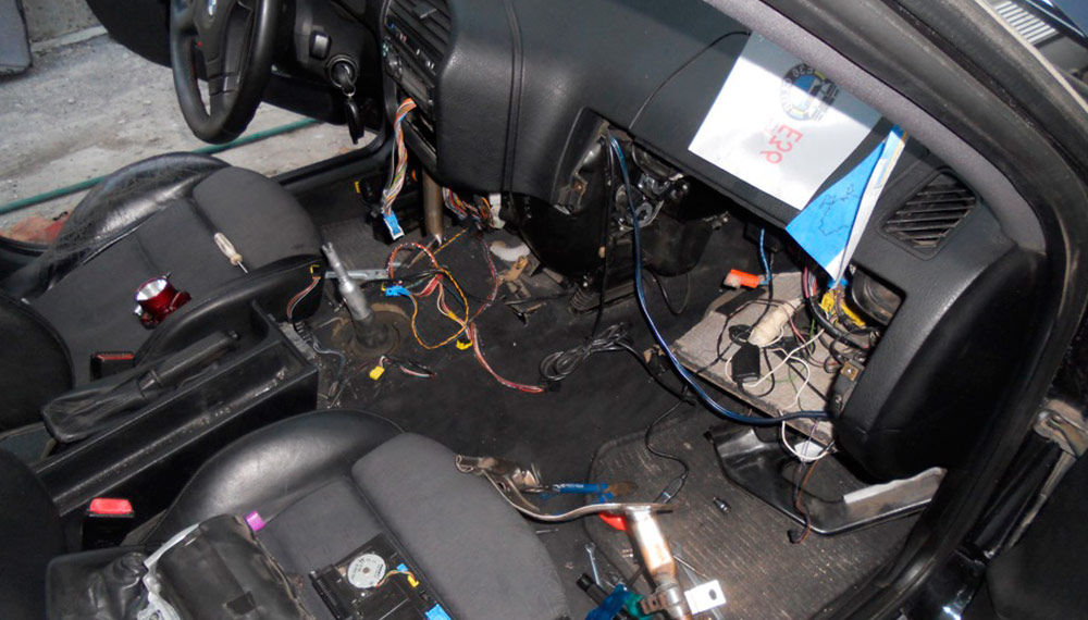 под ней ещё 2 самореза, держат площадке с бардачком и пепельницей. Отсоединяем провода от дрифт — кнопки и прикуривателя. В прикуривателе на подсветку тоненькая фишка — не оторвите. А полярность различается по размерам клемм. А если не знаете что такое дрифт — кнопка, вам не нужен старый бмв. купите приору)