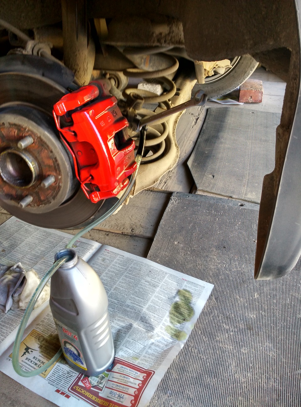 Для замены нам понадобится 1,2-1,5 л тормозной жидкости, стандартный набор инструментов, ключ для штуцеров тормозного механизма, медицинский шприц со шлангом, шланг для прокачки тормозов (30-50 см) и ёмкость для слива отработки.