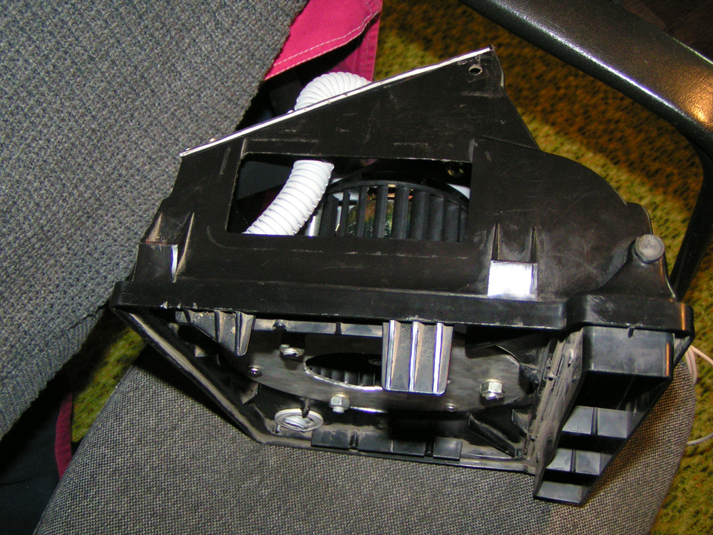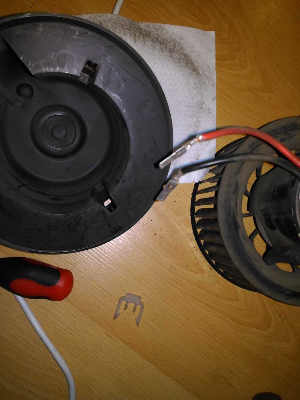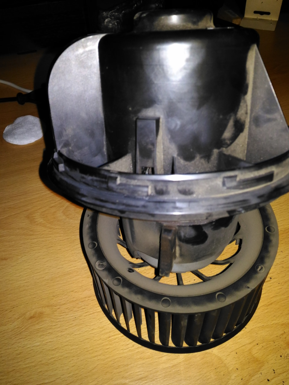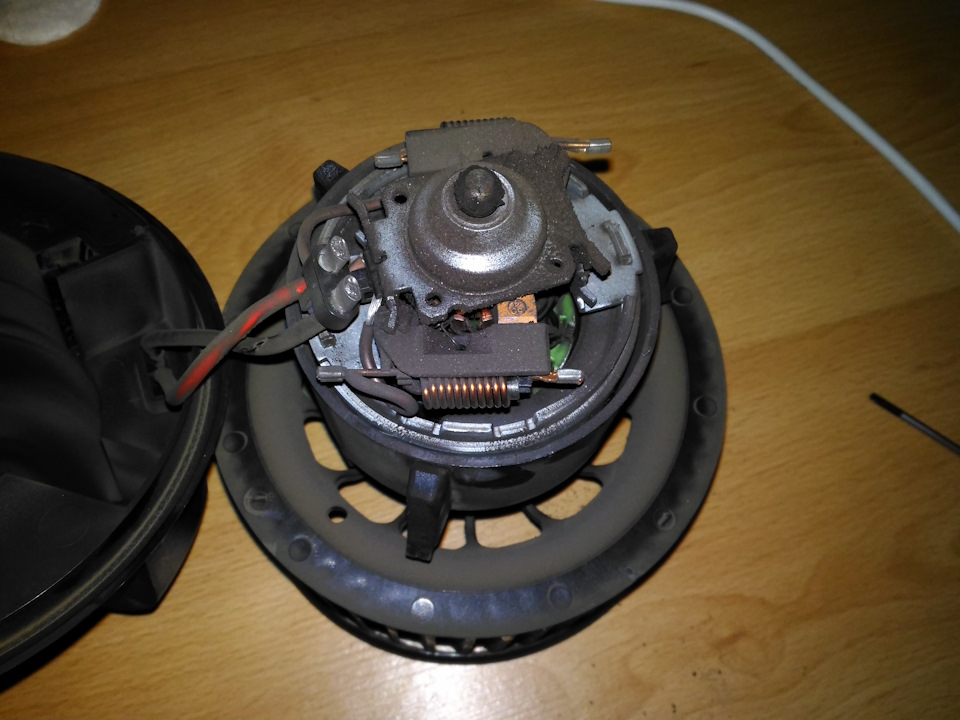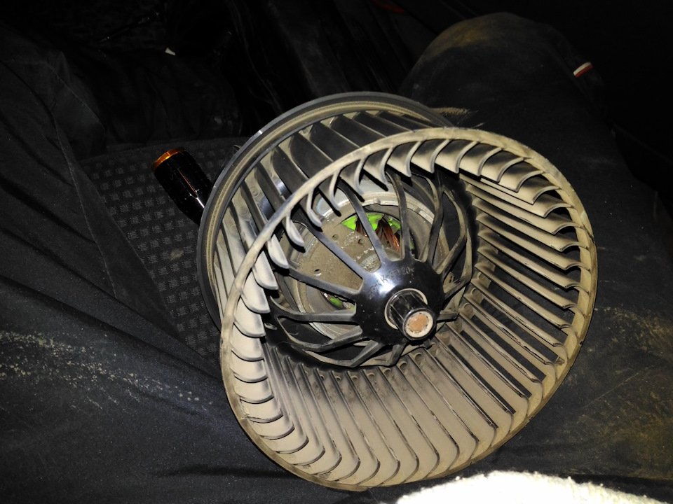 Снимаем джек со стороны бардачка — (заслонка циркуляции воздуха) и Снимаем основное питание со стороны педального узла. Далее снимаем моторчик откручивая 3 болта крепления кожуха и проворачиванием самого моторчика против часовой со стороны педального узла. Всё вытаскивается через предохранители. Вся процедура выкручивания 3 болтов занимает часа полтора. Их практически не видно и всё на ощупь. Теперь всё снято. Начинаем переборку моторчика. Мотор разбирается просто. Крылчатка — прогрев и выстукивание. Ротор — расклепываем.