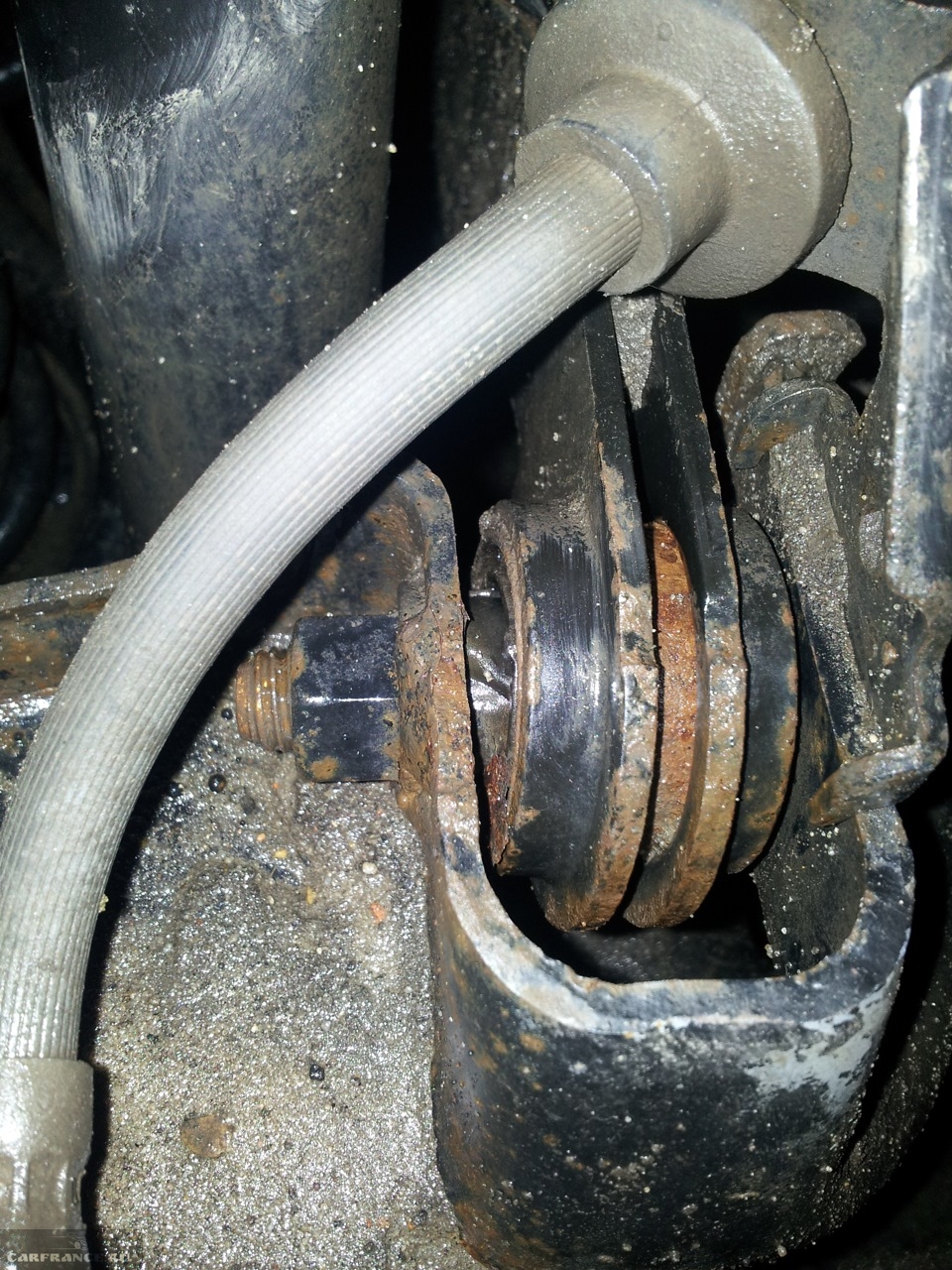 Вытаскивается из крепления на амортизаторе тормозной шланг.