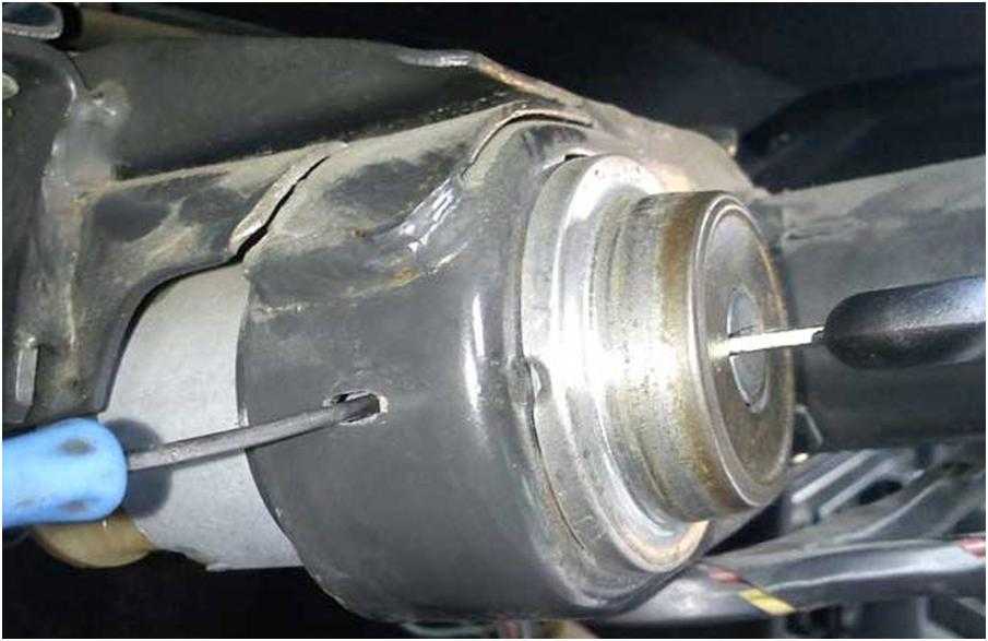 Если блокировка руля произошла вдалеке от вашего гаража, в таком случае можно просто выбить нижнююкрышку замка и вынуть пружину, которая прижимает блокиратор, как показано на фото. После этого у вас будет возможность управлять автомобилем до ближайшего сервиса.