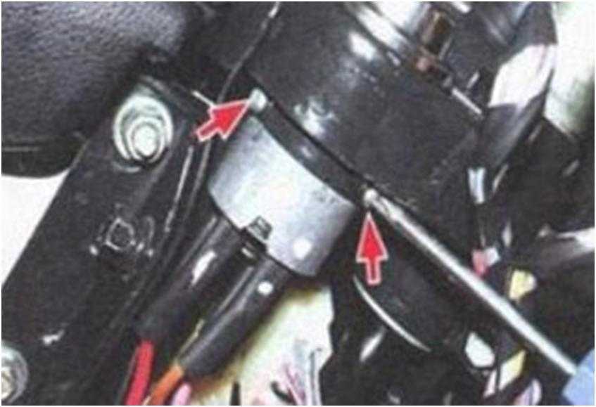 Как и в первом способе выполняем разборку рулевой колонки. После того как будет доступ к корпусу замка зажигания находим на нем фиксатор, который необходимо нажать. Подробно о том, как вытянуть личинку таким способом в следующей публикации.