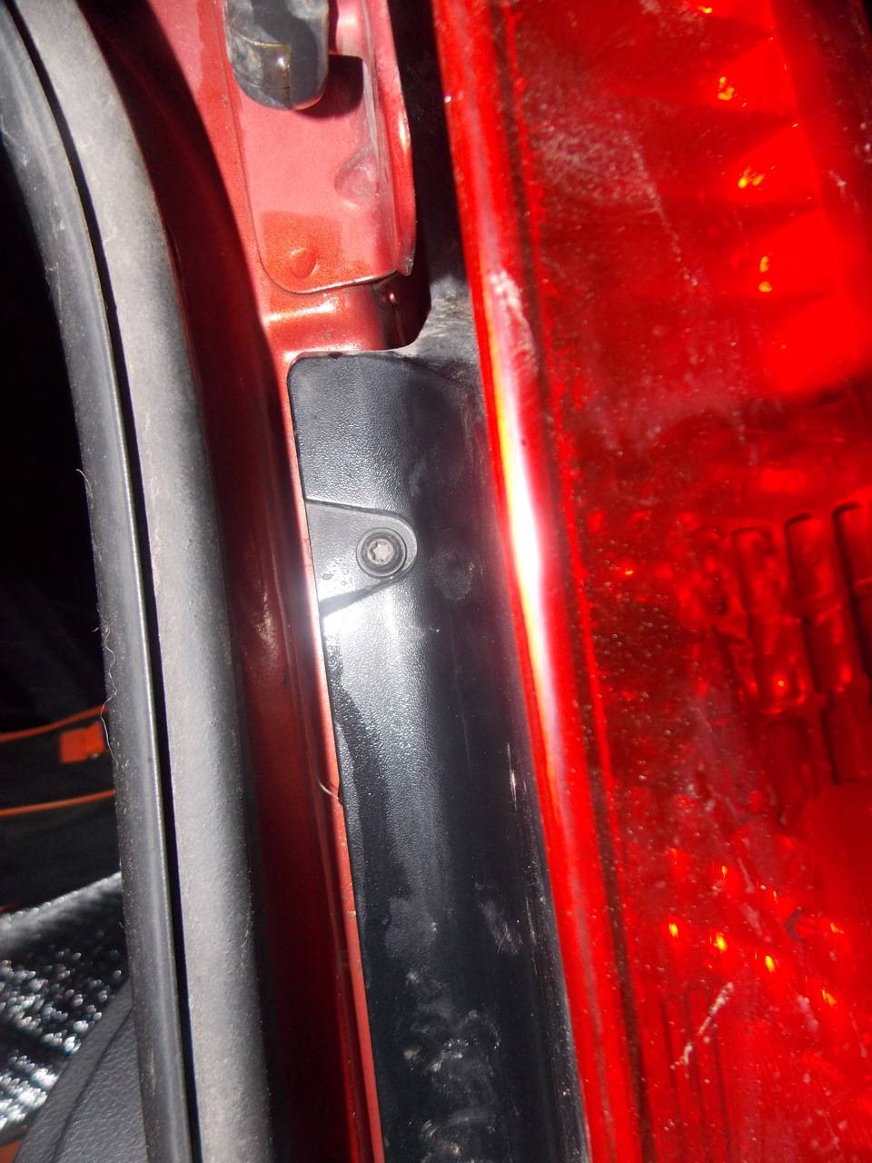 Открываем багажник, видим в углублении между фонарем и уплотнителем 2 шурупа типа Torx (шестилучевая звезда). Выкручиваем их.