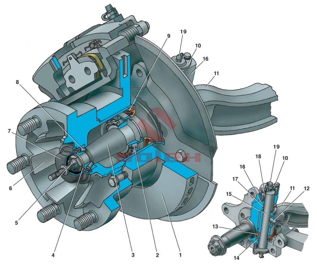 Устройство ступицы передней на автомобиле ГАЗель: 1 – Диск тормоза; 2 – Внутренний ступичный роликоподшипник; 3 – Цапфа кулака; 4 – Блокировочное кольцо; 5 – Центральный крепеж; 6; — Ступица; 7 – Защитный чехол; 8 – Внешний роликоподшипник; 9 – Защитный сальник; 10 – Кожух шкворня; 11 – Балка передней части; 12 – Стопор; 13 – Уплотнительный элемент; 14 – Упорный роликоподшипник; 15 – Шкворень; 16 – Поворотный кулак; 17 – Уплотнитель; 18 – Шкив; 19 – Масленка.