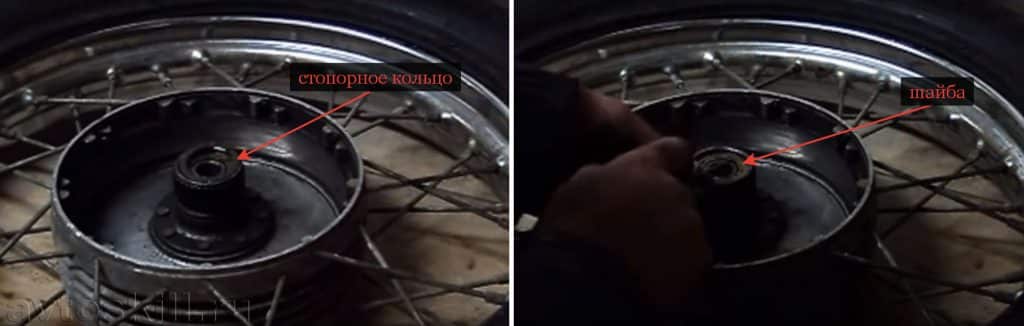 - вынимаем стопорное кольцо, затем шайбу из ступицы;