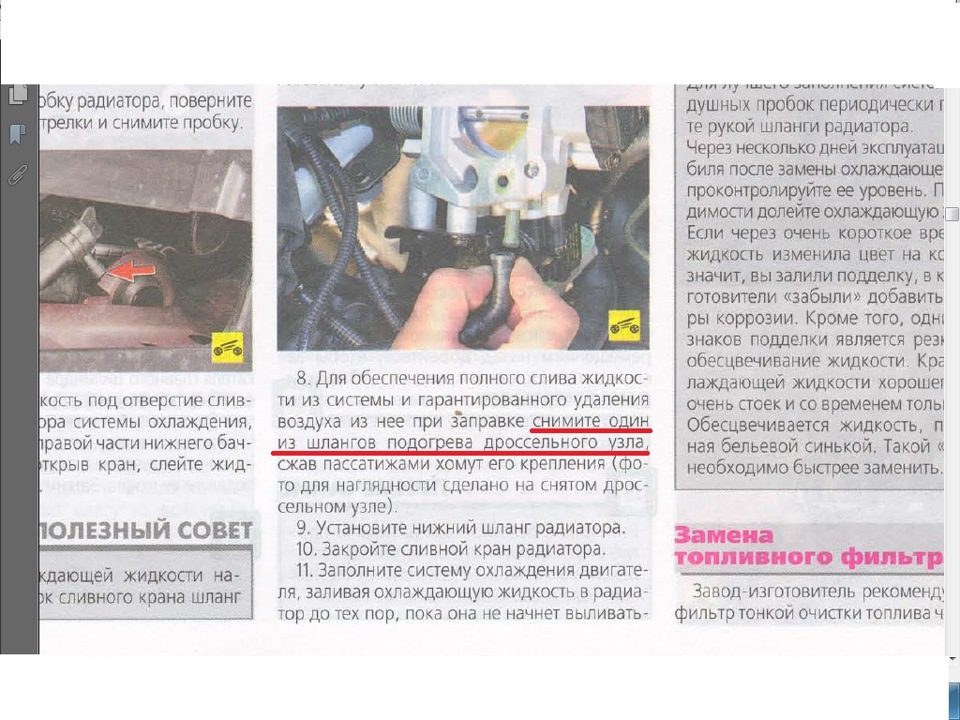 После закрытия сливных отверстий заливаем антифриз в радиатор, пока не выйдет весь воздух, через шланг идущий на дроссель. Ставим шланг на место и продолжаем заполнять радиатор до верха горловины.