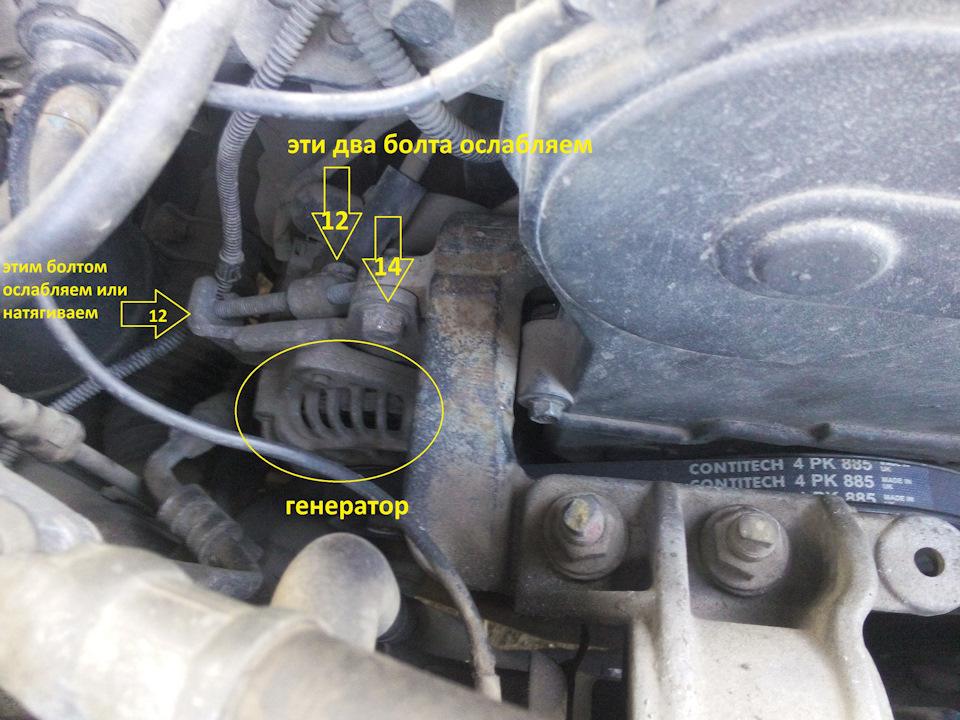 Если через некоторое время после плановой замены ремня ГРМ или другого ремня вспомогательных приводов появился свист во время запуска мотора и увеличении подачи газа при разгоне, то скорее всего ремень генератора нуждается в подтяжке. Необходимы ключи на 10 и 14: