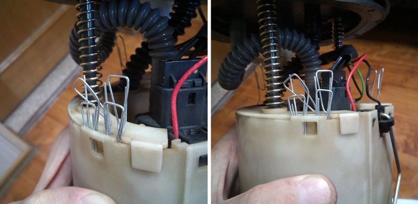 Теперь необходимо снять разъем подачи электропитания и очень аккуратно отделить «стакан» от топливного насоса. Для этого желательно под защелки аккуратно просунуть канцелярские скрепки, чтобы их зафиксировать
