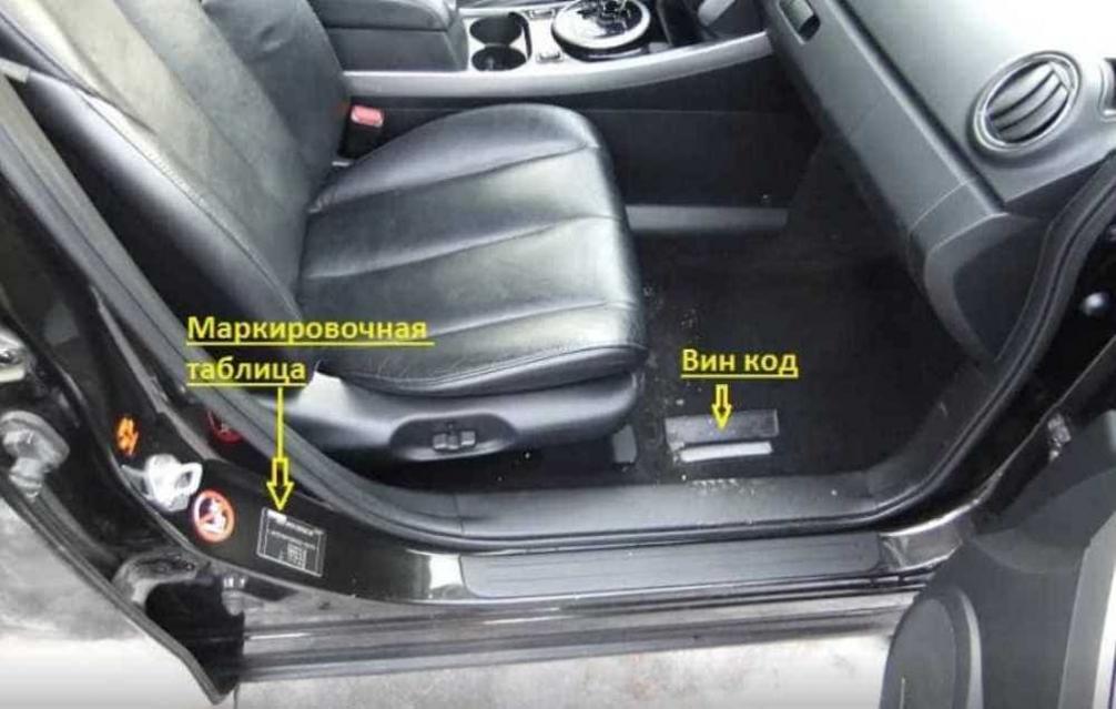 На японских машинах идентификационный номер ТС нужно искать в районе переднего сидения (под ногами пассажира). Здесь часто скапливается грязь и вода, возникают места коррозии. Для осмотра придется сначала снять накладку порога. Так можно получить доступ к креплению панели пола и откинуть крышку лючка. Не каждый продавец согласится на демонтаж порогов. Его придется убедить на эту процедуру или отказаться от покупки машины. Рассмотреть коды на японских авто по другому визуально невозможно.