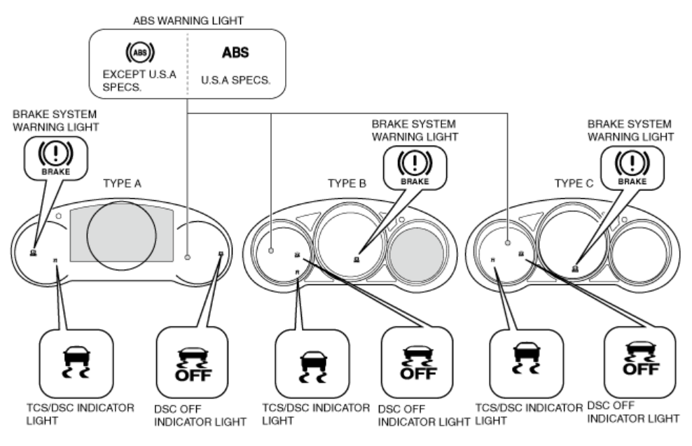 • BRAKE SYSTEM WARNING LIGHT (ПРЕДУПРЕЖДАЮЩИЙ ИНДИКАТОР ТОРМОЗНОЙ СИСТЕМЫ)• ABS WARNING LIGHT (ПРЕДУПРЕЖДАЮЩИЙ ИНДИКАТОР АБС)• TCS/DSC INDICATOR LIGHT (ПРЕДУПРЕЖДАЮЩИЙ ИНДИКАТОР TCS/DSC)• TCS OFF INDICATOR LIGHT (WITHOUT OFF-ROAD TRACTION ASSIST) (ПРЕДУПРЕЖДАЮЩИЙ ИНДИКАТОР ВЫКЛЮЧЕНИЯ TSC БЕЗ СИСТЕМЫ ПОМОЩИ ПРИ ДВИЖЕНИИ ПО БЕЗДОРОЖЬЮ)• OFF-ROAD TRACTION ASSIST INDICATOR LIGHT (ПРЕДУПРЕЖДАЮЩИЙ ИНДИКАТОР СИСТЕМЫ ПОМОЩИ ПРИ ДВИЖЕНИИ ПО БЕЗДОРОЖЬЮ)