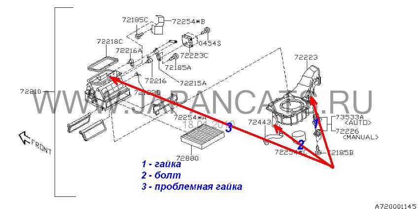 Третью (верхнюю) гайку можно не трогать. Для того чтобы вытащить воздушный короб без проблем, нужно открутить часть металлического упора слева (2 гайки на 10), к которому крепилась панель бардачка слева. Затем откручиваем нижние болт и гайку воздуховода, и просто отстегиваем нижнюю часть короба(черная) от верхней в которую ставится фильтр салона(у меня белая), она на защелках — слева и справа по одной. После чего нижняя часть вынимается без проблем.