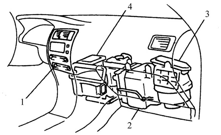 1. Панель управления кондиционером 2. Кондиционер 3. Блок вентилятора 4. Блок отопителя