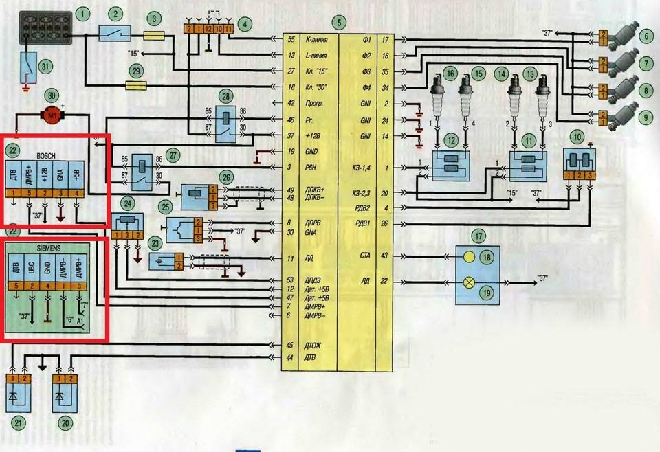 Схема 1. Соединения системы управления двигателем мод. ЗМЗ-409 (Евро-2)