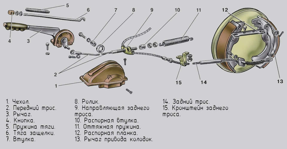 Исторически первая система стояночного тормоза работает по механическому принципу. Внутри салона есть рычаг, который через систему регулировочных болтов соединен с колодками на задних колесах: