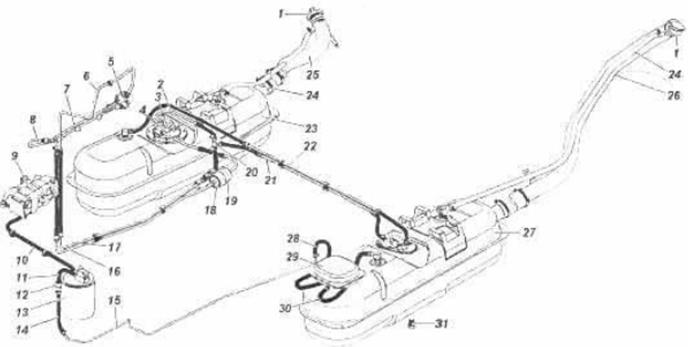 - откройте люк в полу кузова над электробензонасосом 3 (правый бак) или отверните болты крепления сепаратора 29 и выньте его (левый бак), отсоедините шланги 28, 30;