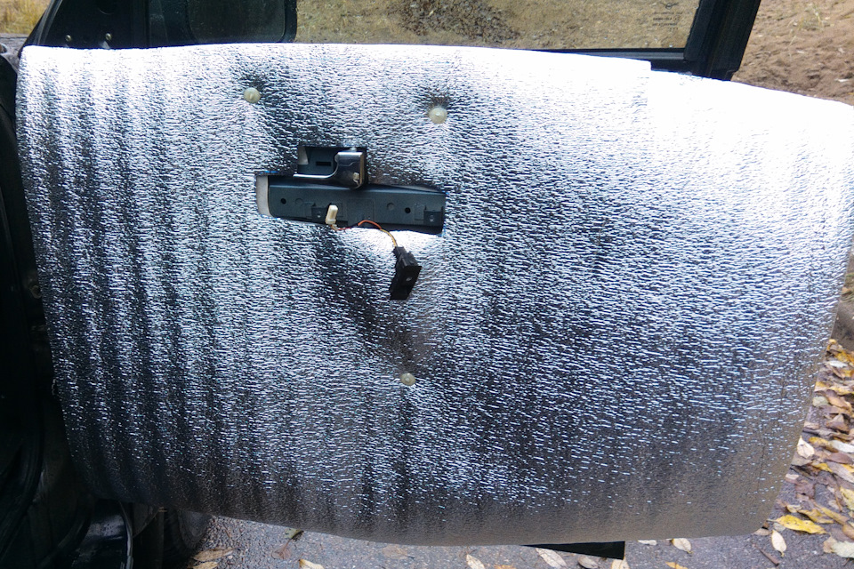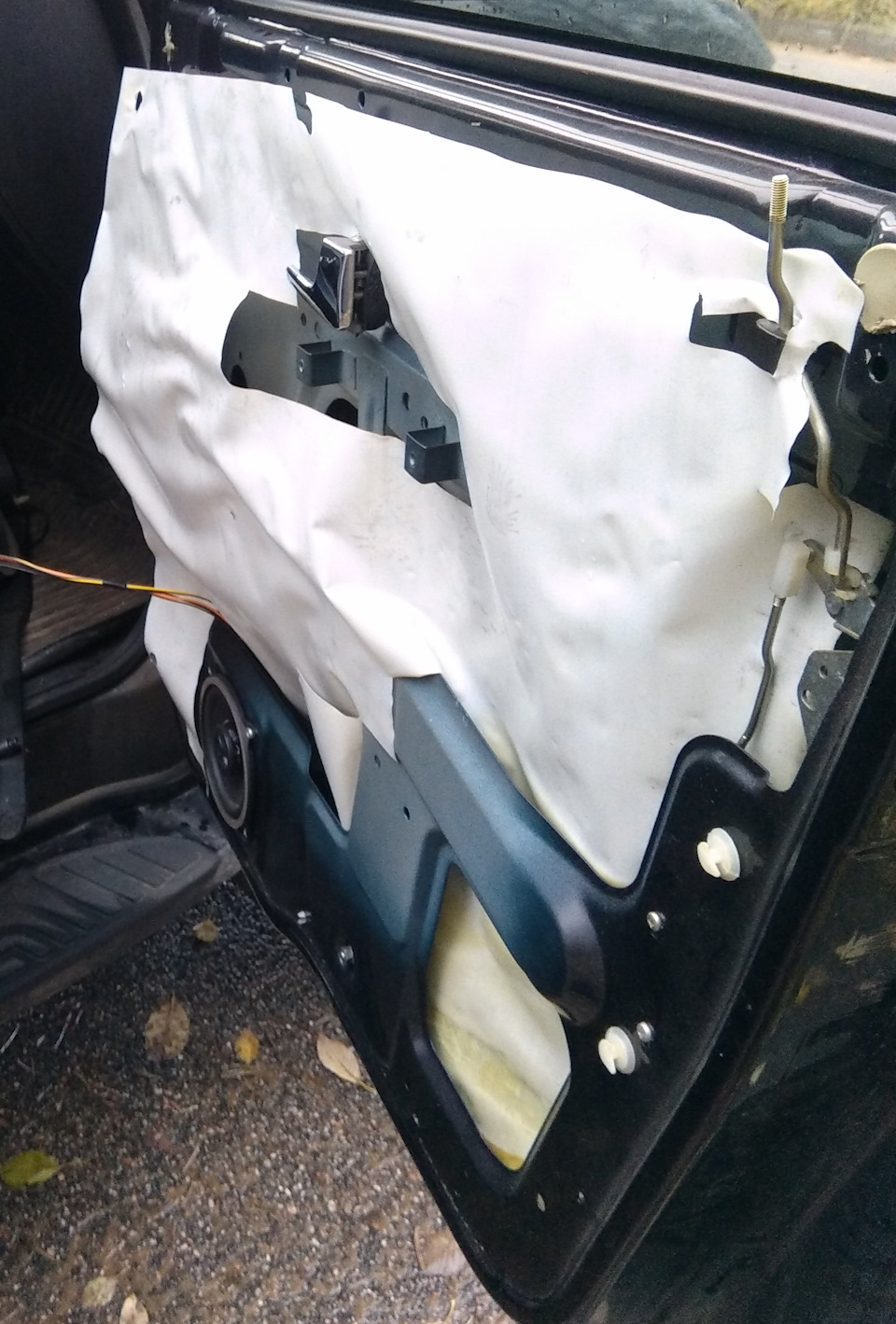 Под дверной картой расположен лист влагозащитной пленки, которая крепится на дверку на герметик или саморезы. Если необходимо разбирать дверь для ремонта замков, стеклоподъемника, установки новой шумоизоляции и пр., то необходимо подготовить сменную пленку, поскольку заводская изоляция рассчитана на единичную установку.