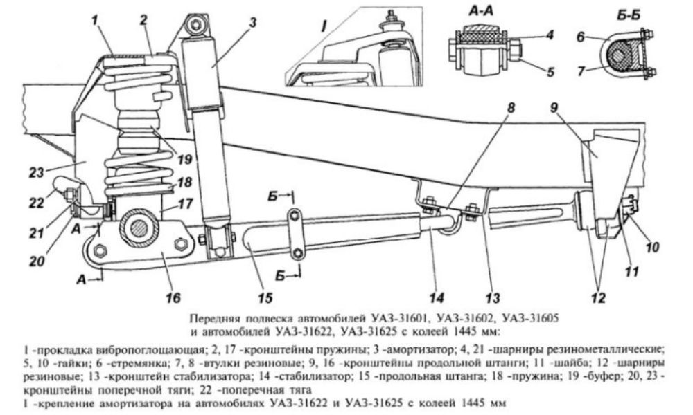 Подробная схема с описанием передней подвески УАЗ Патриот