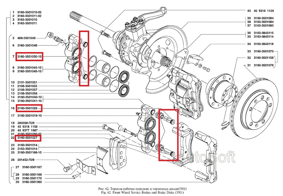 Передние суппорта подлежат ремонту, о чем уже было оговорено выше. Чтобы его произвести, потребуется приобрести ремкомплект для Патриота. В ремкомплект входят следующие детали: