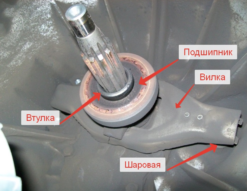 Автомобиль УАЗ патриот следует установить на смотровую яму. Демонтировать коробку передач. Рукой нужно оттянуть изделие вперед по направляющей втулке вместе с вилкой. После этого нужно снять вилку с шаровой опоры, осуществив ее сдвигание к себе. Выжимной подшипник на внедорожнике УАЗ Патриот извлекается вместе с вилкой. После этого из вилки нужно извлечь муфту с подшипником. В муфте имеется два специальных паза, фиксирующих ее в вилке (ниже показано стрелкой).