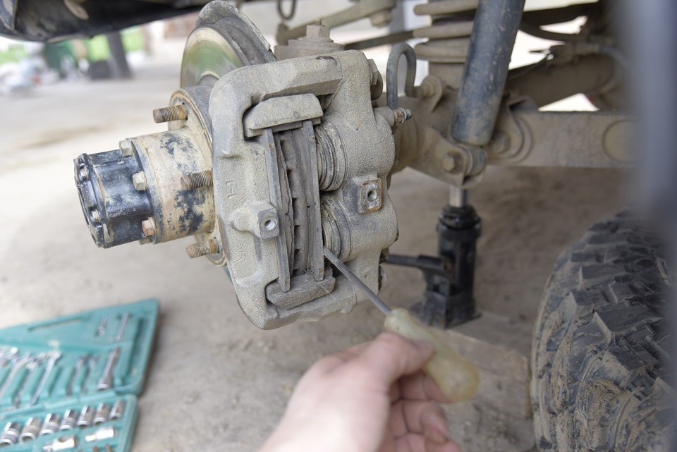 Отверткой поочередно вдавить поршни в цилиндры. Вытекание тормозухи с штуцера является нормой. По завершению утапливания поршней требуется перекрыть отверстие, чтобы воздух не зашел в контур.