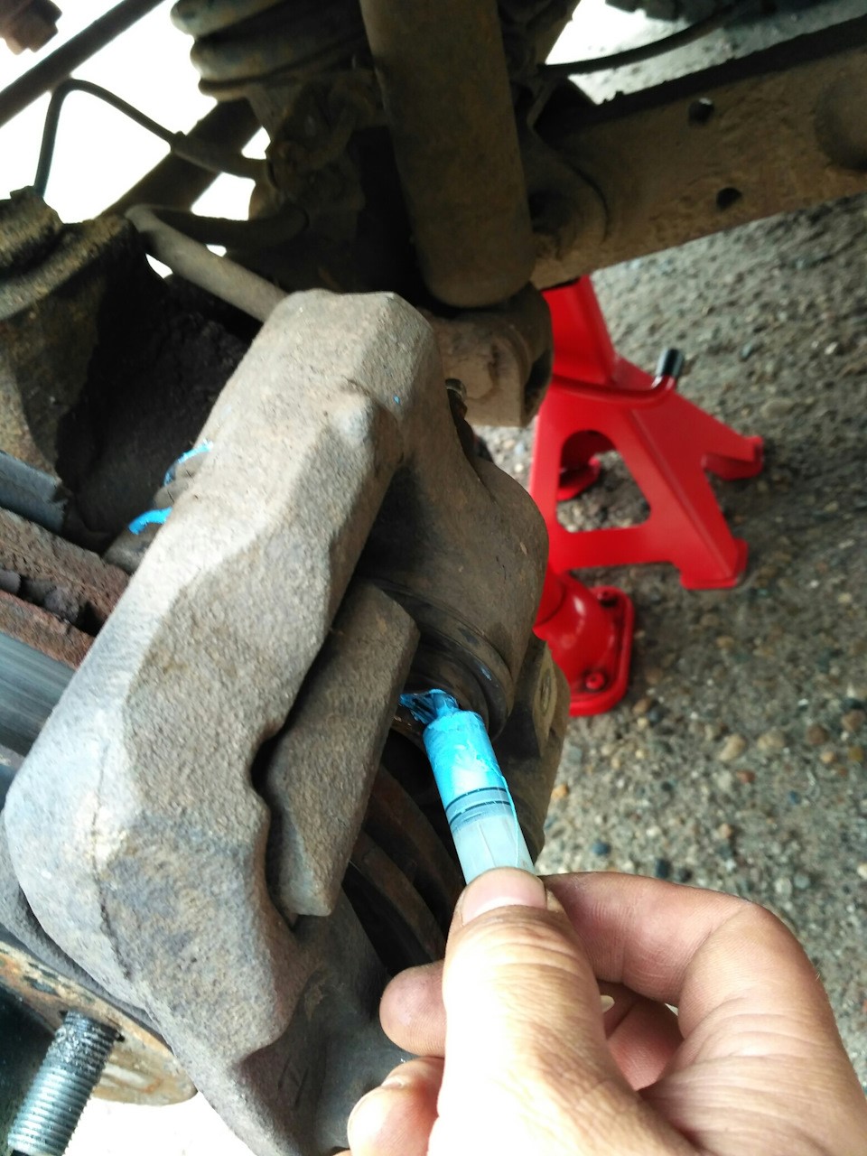 Смазать тормозные поршни спецсредством. Для этого при помощи шприца внести смазку под пыльник.