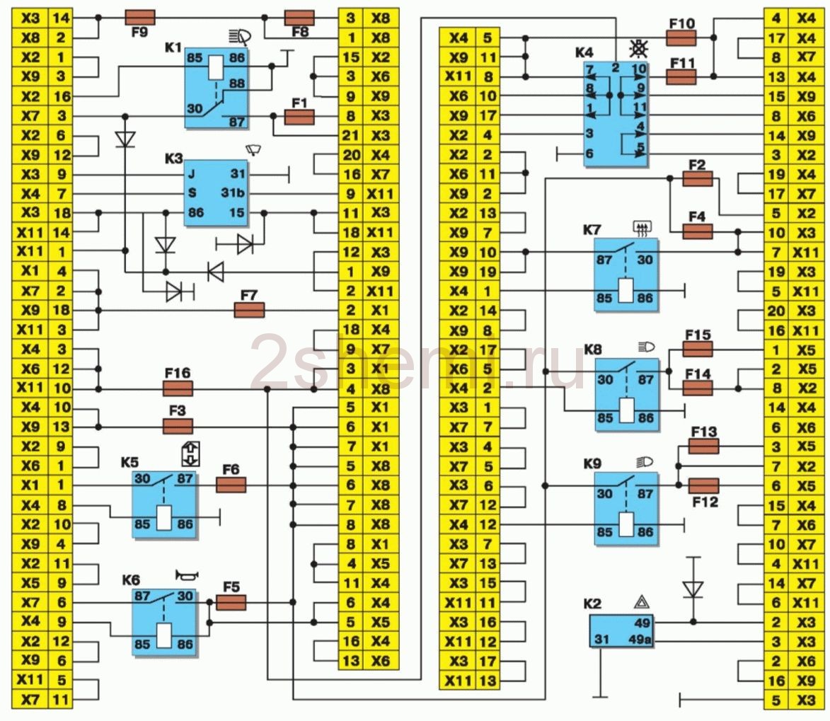 K1-реле включения очистителей фар VAZ 2108; K2-реле-прерыватель указателей поворота и аварийной сигнализации; K3-реле стеклоочистителя ветрового окна; K4-реле контроля исправности ламп; K5-реле включения стеклоподъемников; K6 — реле включения звуковых сигналов; K7-реле включения электрообогрева заднего стекла; K8-реле включения дальнего света фар; K9-реле включения ближнего света фар; F1-F16 — плавкие предохранители.