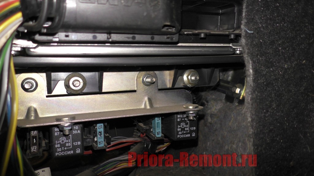 Когда заглушка снята, необходимо найти две гайки крепления ЭБУ снизу к металлической планке. Хорошо видно это на фото ниже.