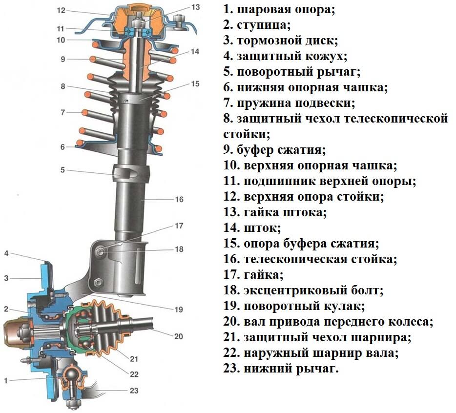 Схема передней подвески автомобиля Приора с цифровыми обозначениями показана на рисунке.