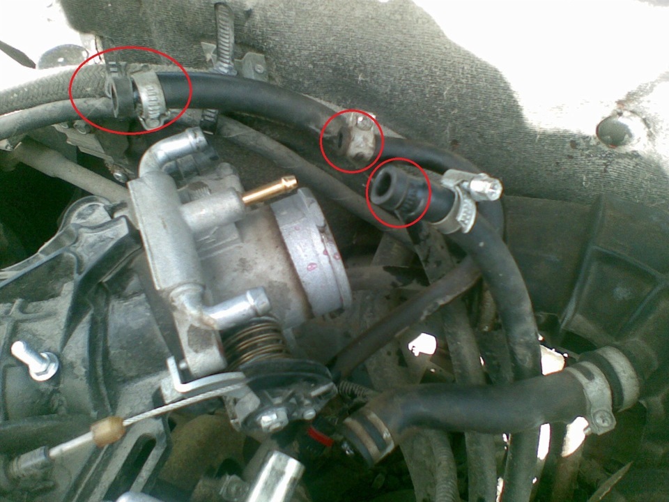Далее снимаем патрубки обогрева заслонки, предварительно ослабив хомуты. Чтобы внутрь не попала грязь, можно заткнуть патрубки тряпкой. После этого желательно отсоединять шланг, с помощью которого осуществляется вентиляция топливного бака. Теперь осталось отвинтить болт, снять тросик дросселя и достать саму заслонку.