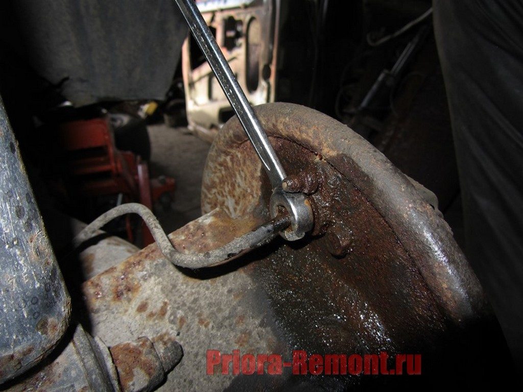 Итак, подождав пока смазка начнет действовать, откручиваем гайку крепления тормозной трубки при помощи спец. ключа: