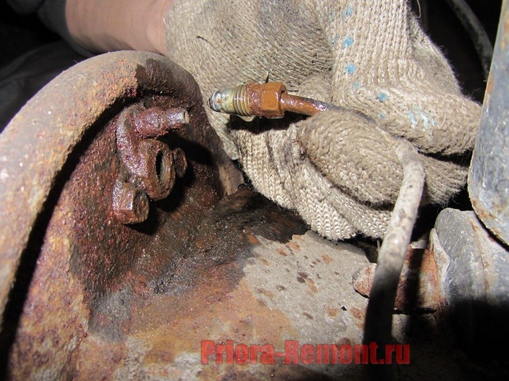 2. Удаляем воздух из гидропривода тормозов и про веряем на отсутствие утечек соединения тормозного шланга и трубок.