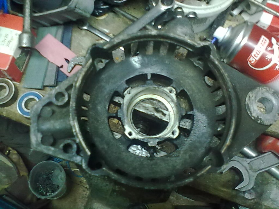 Это был подарок, всё сразу легко разобралось. Потом скинул регулятор напряжения вместе с щётками (щётки ещё побегают, очень даже прилично выглядят). Разобрал генератор на три части.Снял переднюю крышку с подшипником, вытащил ротор ну и сам корпус со статором.