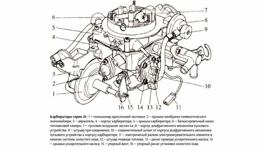 Совет. Производить обслуживание карбюраторов серии 2Е2 и 2Е3 необходимо предельно аккуратно, стараясь не повредить резьбу и отверстия.