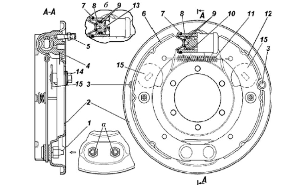 В верхней части тормозного щита крепится разжимный механизм, а в нижней — регулировочный. Обе колодки тормоза одинаковые.
