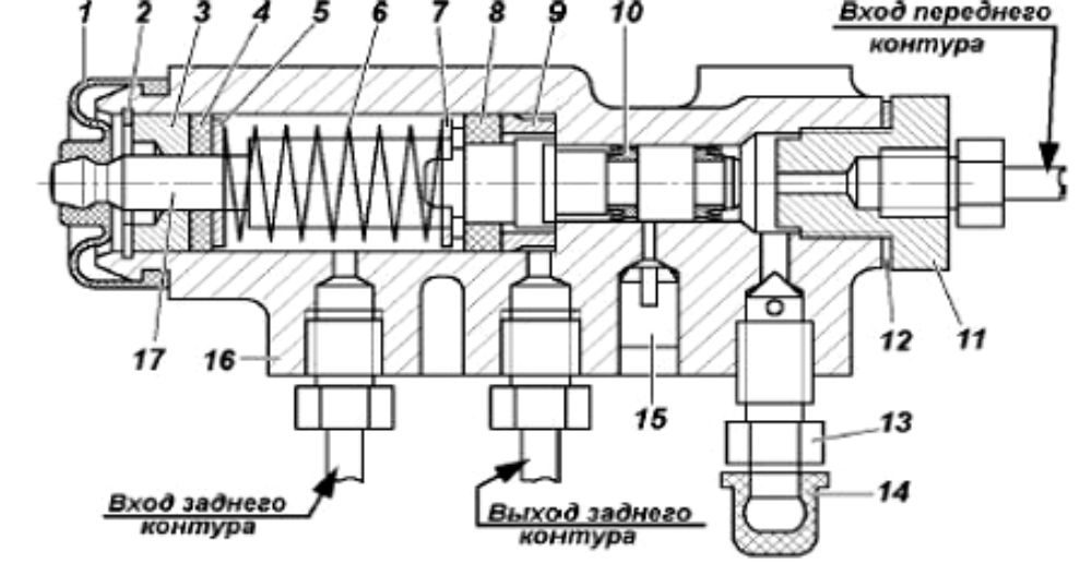 При нажатии на педаль тормоза поршень регулятора давления должен выдвинуться из корпуса на 1,7 — 2,3 мм. Отсутствие хода поршня, а также его недостаточный или чрезмерный ход свидетельствует о неисправности регулятора или его привода.