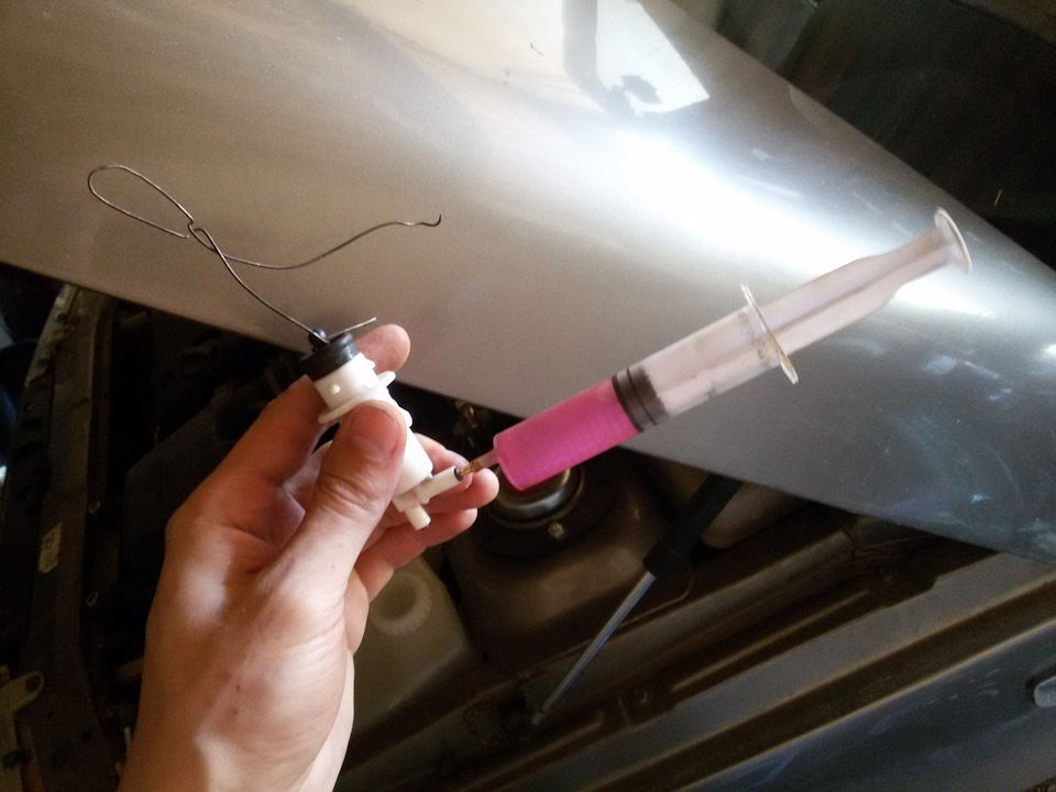 Затем к штуцеру подключается шприц, предварительно наполненный антифризом или обычным тосолом.