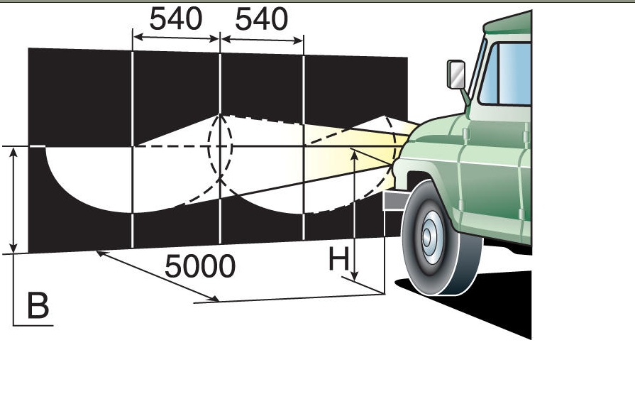 Н – расстояние от центра фар до уровня земли; В=Н–65 мм.