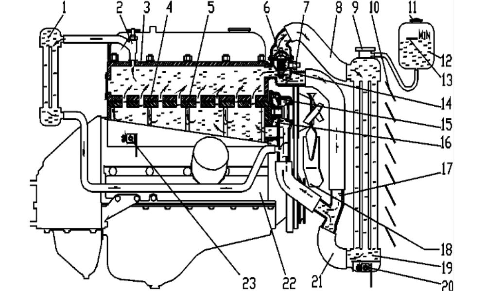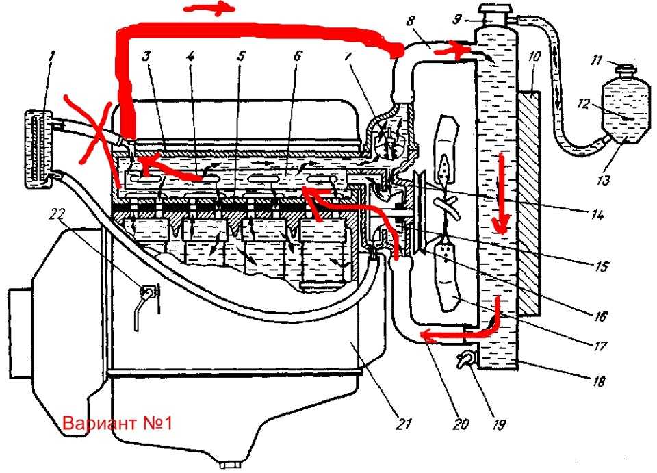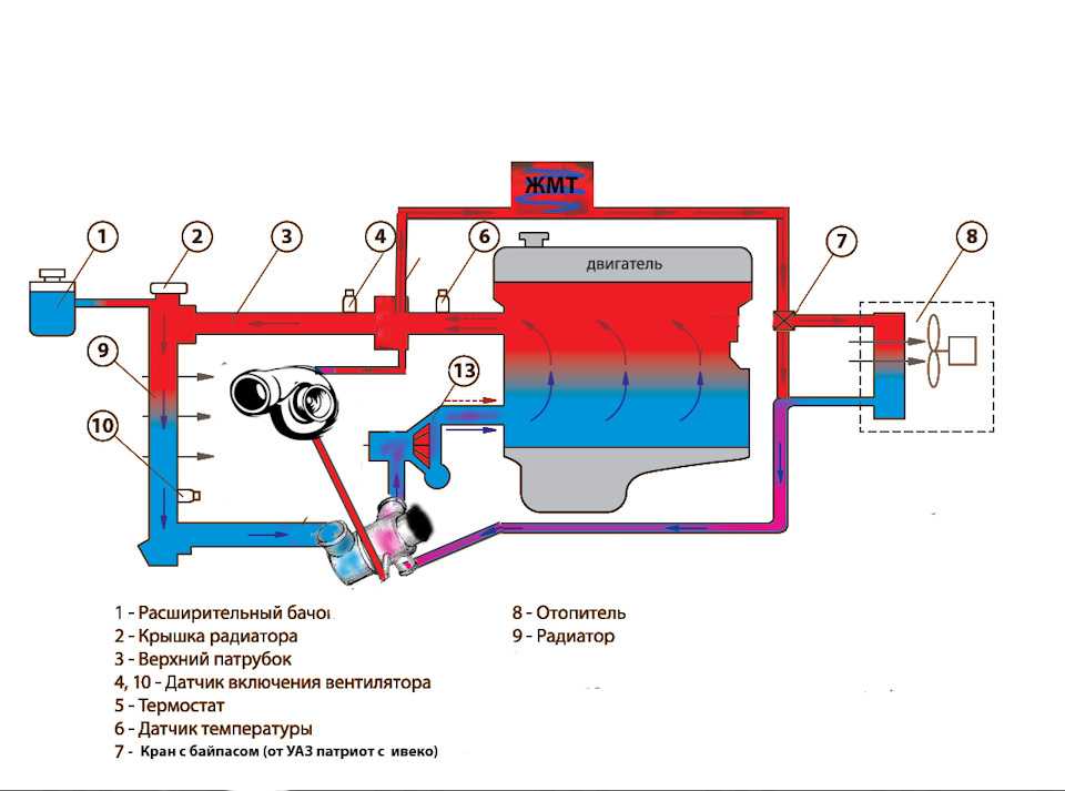 Рис.1. Система охлаждения двигателей УМЗ-421, УМЗ-4218 для автомобилей автомобилей УАЗ-Хантер, УАЗ-31512, УАЗ-3303, 2206