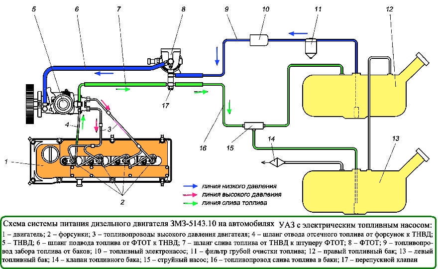 Избыточное топливо, а также попавший в систему воздух отводятся от форсунок, ТНВД и перепускного клапана по топливопроводам слива топлива в баки.